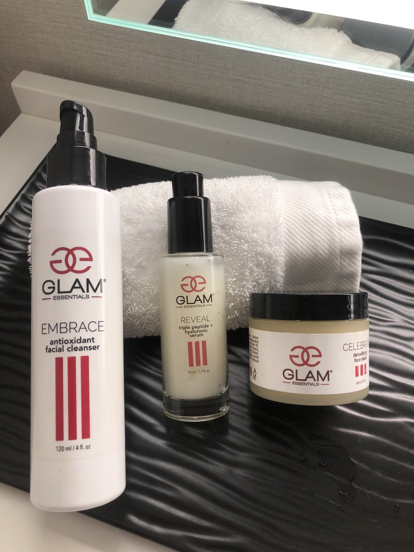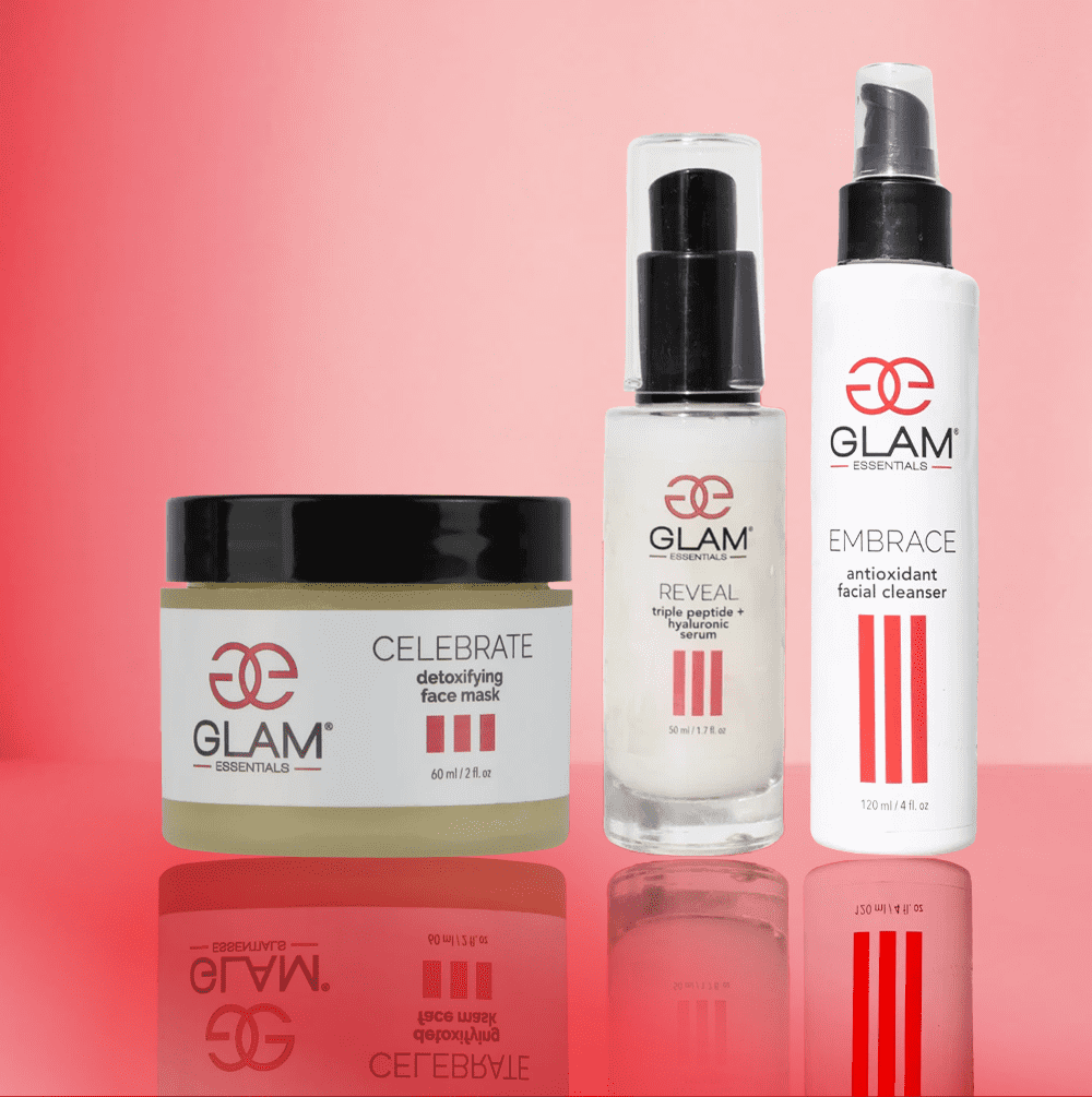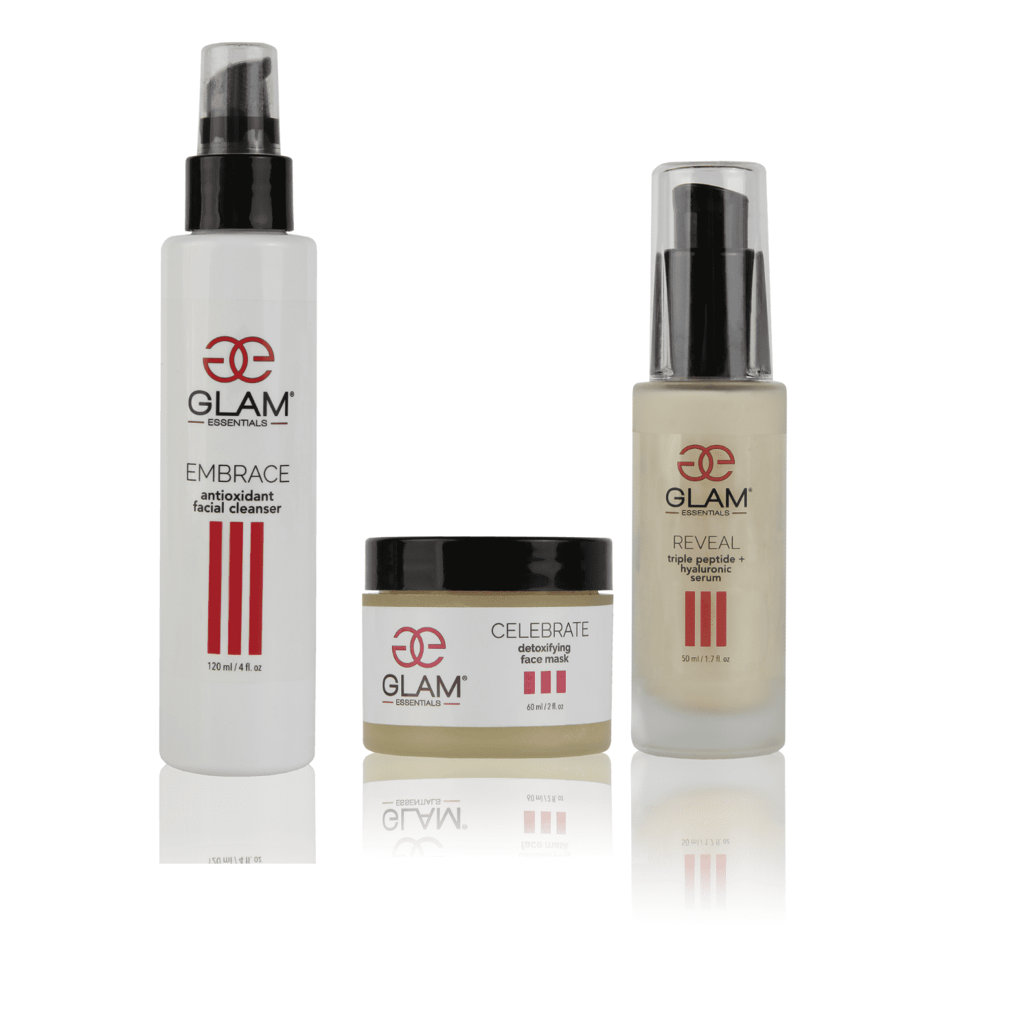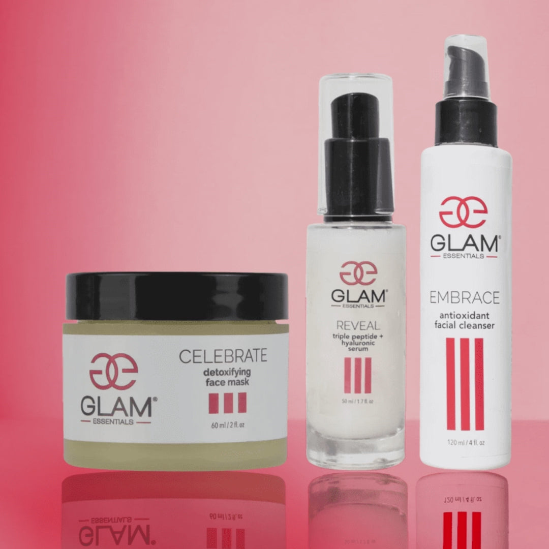 Our Face Essentials Trio will Cleanse, detox, and brighten your skin in three simple steps. You'll receive: Embrace Antioxidant Cleanser(4 oz), Celebrate Detox Mask (2 oz.), Reveal Triple Peptide Serum (1 oz).